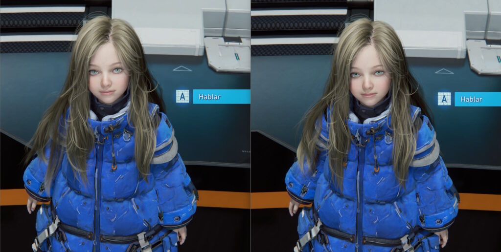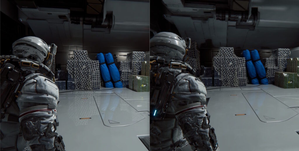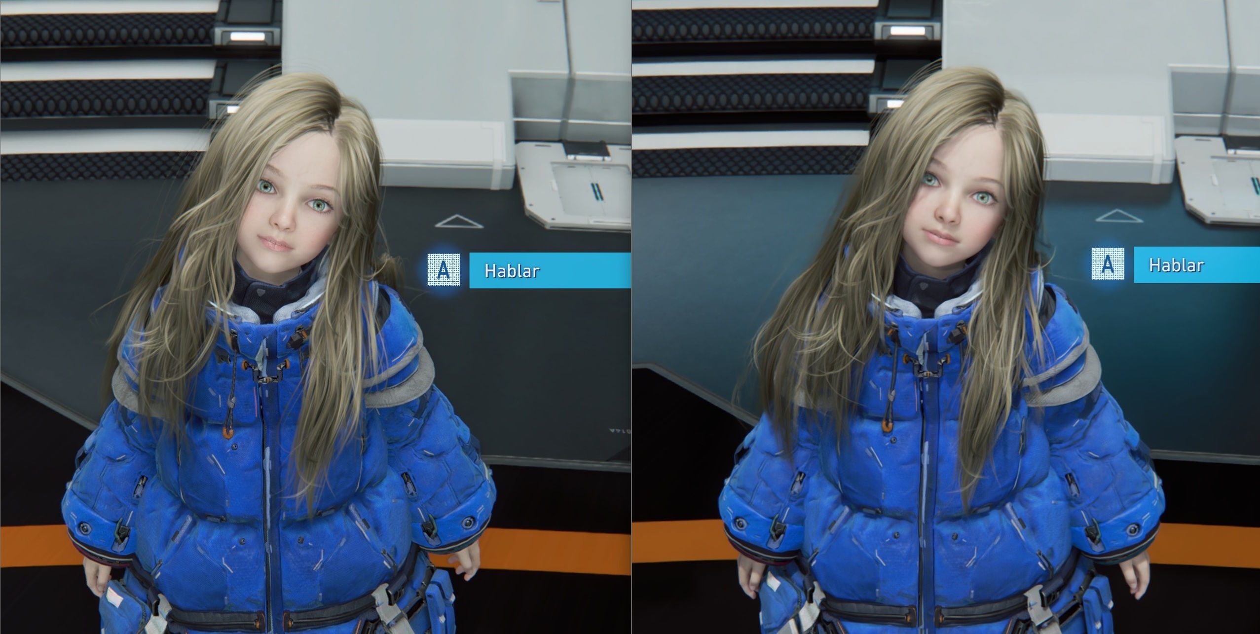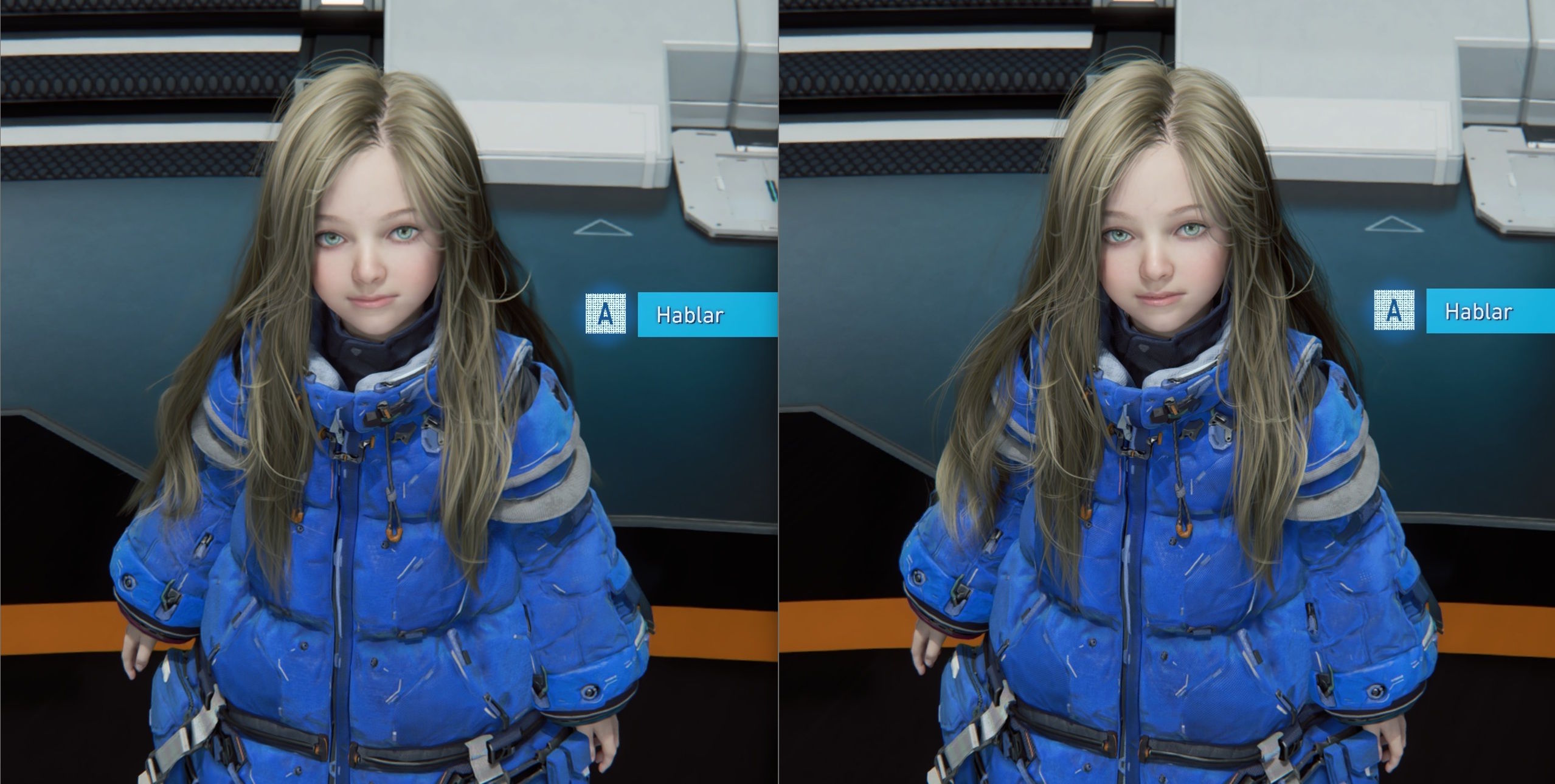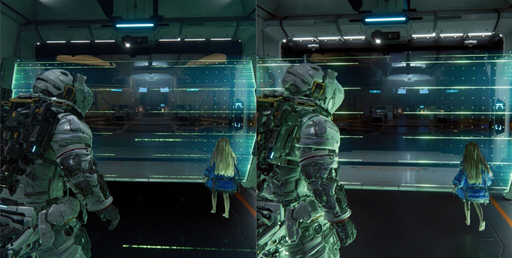 Слева у нас применен DLSS 4 Super Resolution в режиме качества, а справа мы запускаем Pragmata с DLAA. Различия настолько незначительны, что их довольно сложно оценить, и это во многом говорит в пользу технологии масштабирования NVIDIA с использованием искусственного интеллекта.