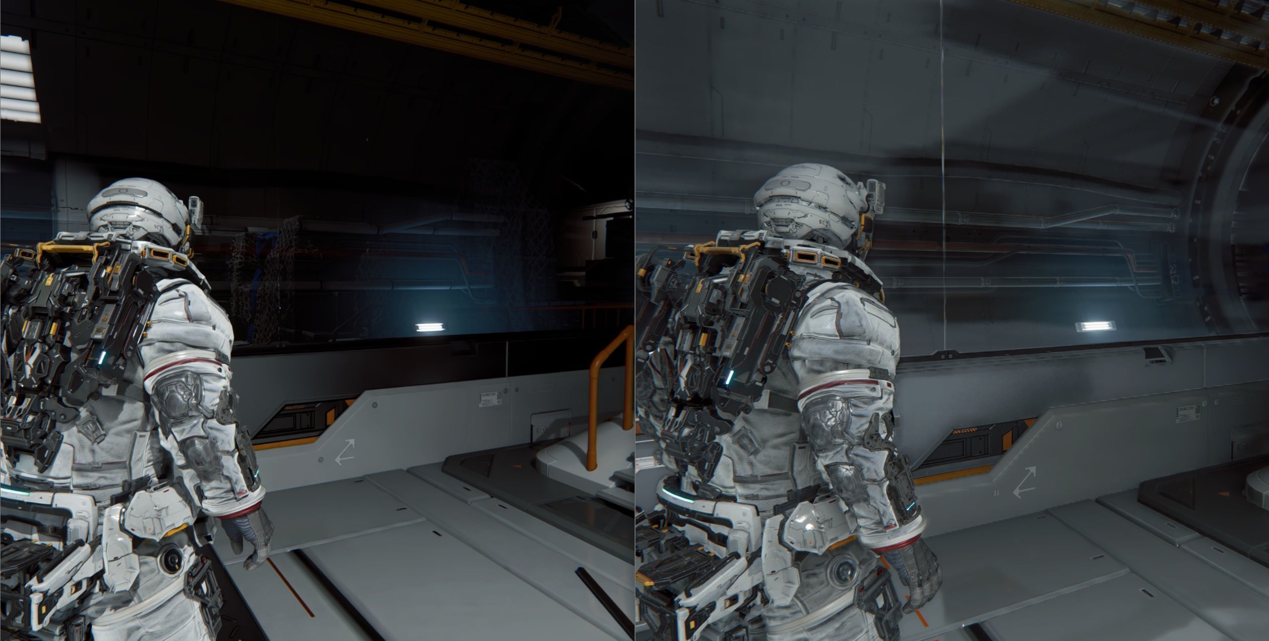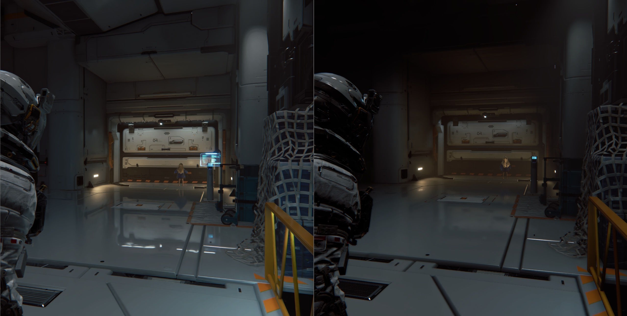 На втором изображении справа активировано построение траекторий, и снова разница огромна. С помощью этой активированной технологии Цель тонко отражается от земли, мы также видим отражения от земли на заднем плане и видим, что зеленый свет сканера взаимодействует с персонажами на другом уровне. Например, костюм Хью гораздо более реалистично и в соответствии со сценой отображает воздействие этого освещения, то же самое и с одеждой Дианы.