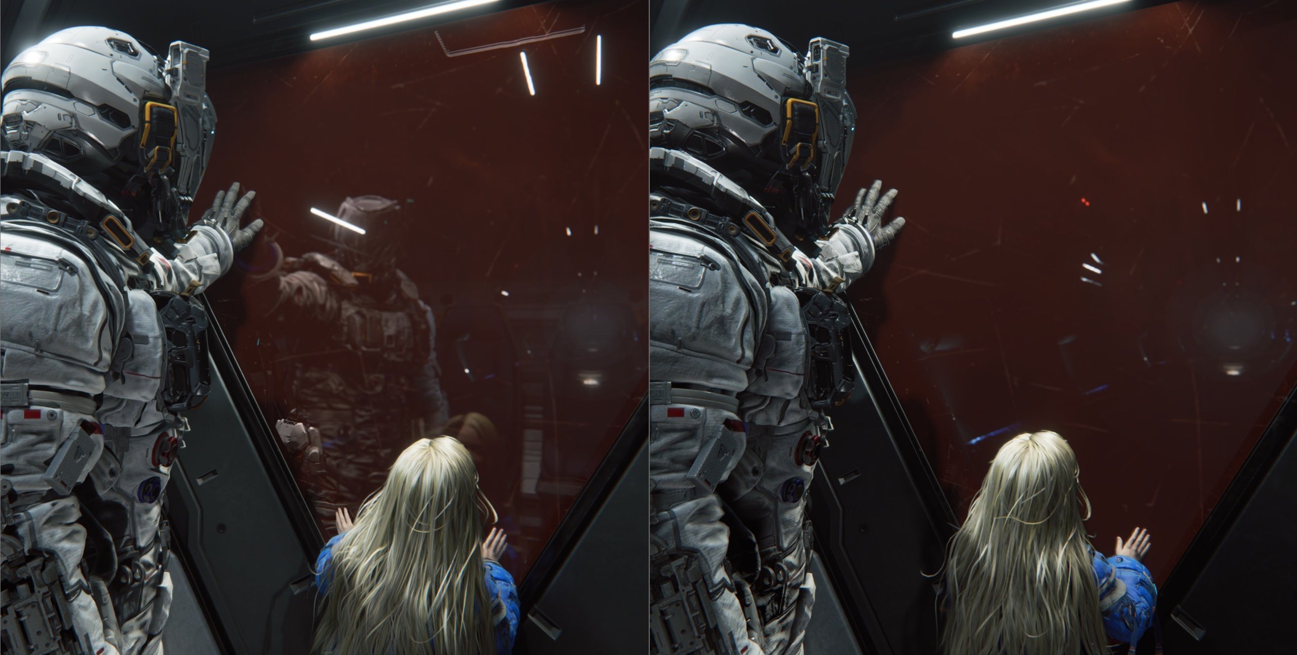 Это последнее изображение — одно из моих любимых. У нас есть построение траектории, включенное слева и выключенное справа. Эта технология позволяет получить реалистичные отражения Хью и Дианы на кристалле, которых нет при растеризации. У нас также есть гораздо более реалистичное освещение, и тени, которые неправильно генерируются при растеризации, исчезают, например, тени Хью на металлической части рядом со стеклом, между ним и Дианой.