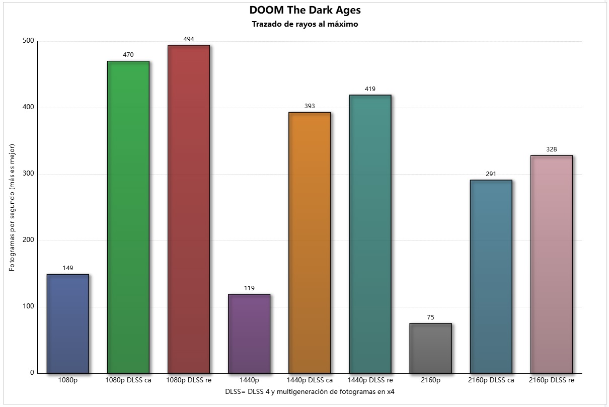 Невозможно добиться стабильных 60 кадров в секунду на GeForce RTX 5090 FE ни в одной из этих двух игр с собственным разрешением 4K и максимальным качеством, не прибегая к масштабированию. Тем не менее, DOOM The Dark Ages работает со средней скоростью от 75 до 85 кадров в секунду при разрешении 4K со сверхскоростным качеством, и в этой игре используется трассировка лучей, применяемая к освещению, бликам и теням.