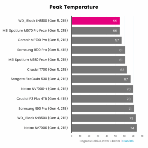 Такая высокая скорость не приводит к повышению рабочей температуры. В ходе тестирования модели на 2 ТБ температура накопителя под нагрузкой достигала 55 °C. По нашим меркам, это один из самых «холодных» твердотельных накопителей на рынке, но учтите, что это было при использовании встроенного в материнскую плату радиатора.
