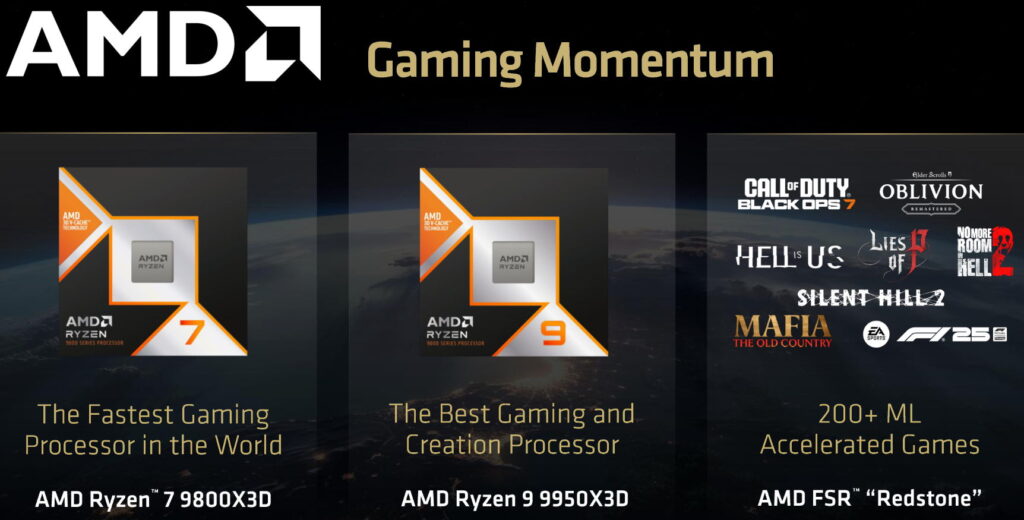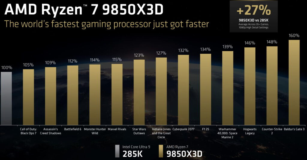 В играх он обещает быть на 7% быстрее, чем Ryzen 7 9800X3D, и в среднем на 27% быстрее по сравнению с Core Ultra 9 285K. Мы настаиваем, всегда основываясь на цифрах AMD.