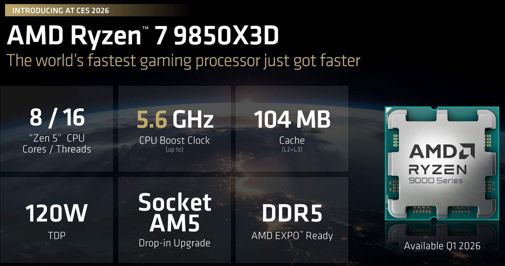 AMD представила свои новые процессоры на выставке CES 2026, в том числе новую серию Ryzen AI 400, две новые модели Ryzen AI Max + и Ryzen 7 9850X3D, который производитель рекламирует как самый быстрый игровой процессор на рынке.
