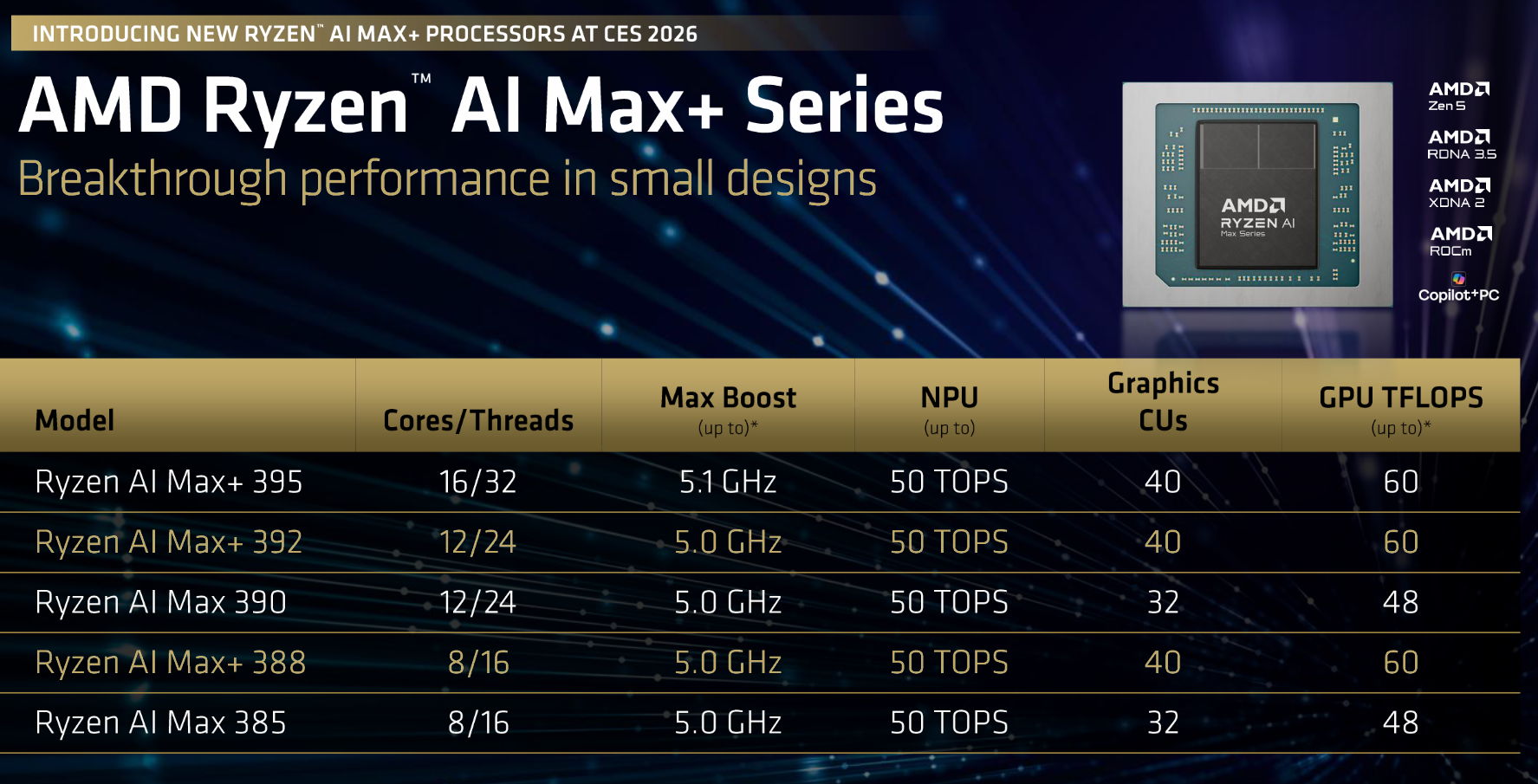 AMD добавляет в линейку новые модели Ryzen AI Max + 392 и 388, обе с полностью включенными графическими процессорами, но с частично включенными 12- и 8-ядерными процессорами. Снижение производительности процессора не должно сильно сказаться на игровой производительности или вообще не должно повлиять на нее, и новые модели могут предложить немного более дешевые варианты для тех, кто хочет максимизировать графическую производительность, не платя за дополнительные ядра процессора, которые им строго не нужны.