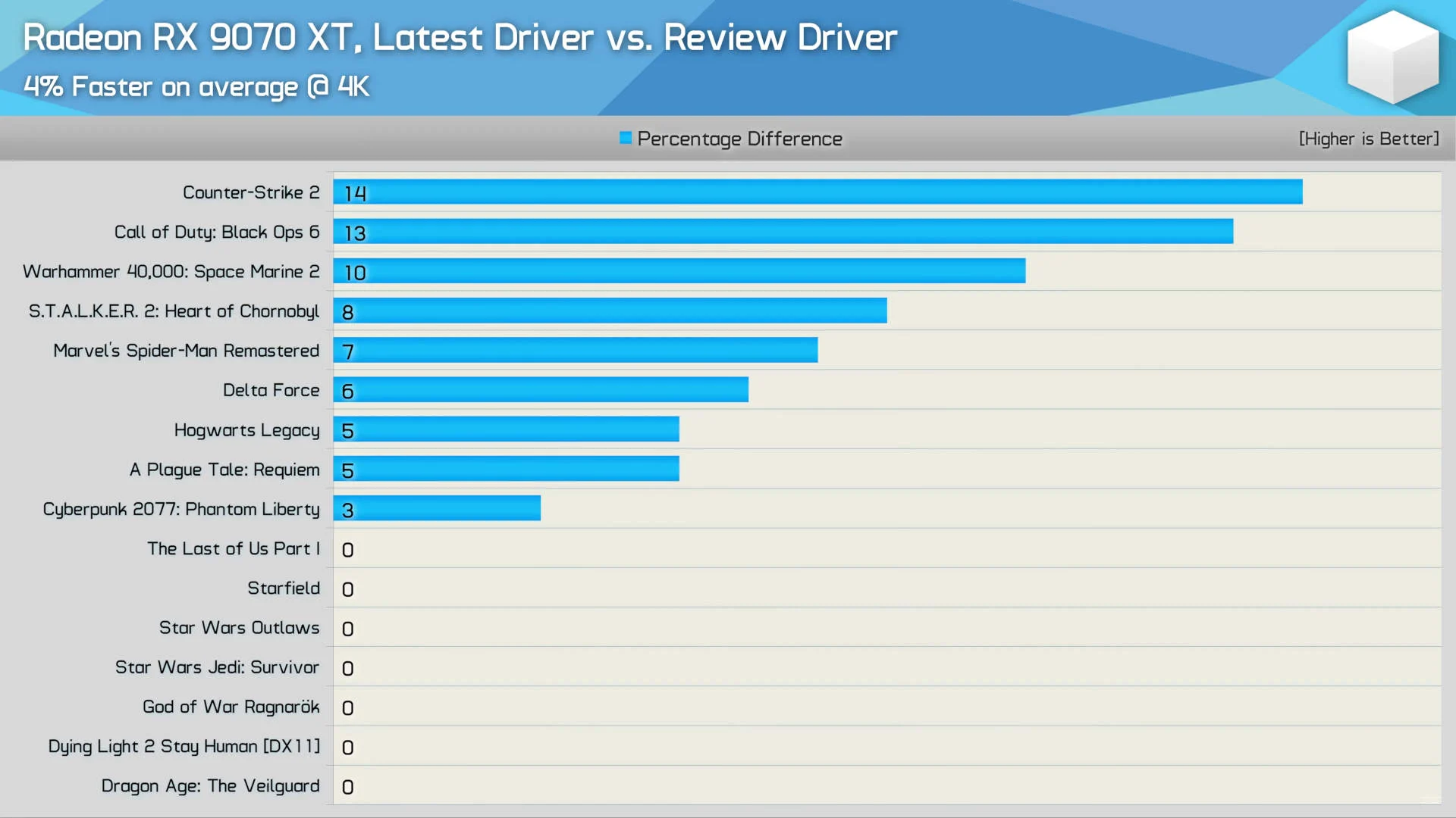 Эти результаты захватывающие, но несколько игр не показали никаких изменений в частоте кадров ни при одном из разрешений. Такие игры, как Dragon Age: The Veilguard, The Last of Us Part I и Star Wars Jedi: Survivor, работают точно так же, как и при запуске на Radeon RX 9070 XT. Такова природа обновлений драйверов, когда улучшения производительности возможны, но не всегда гарантированы.