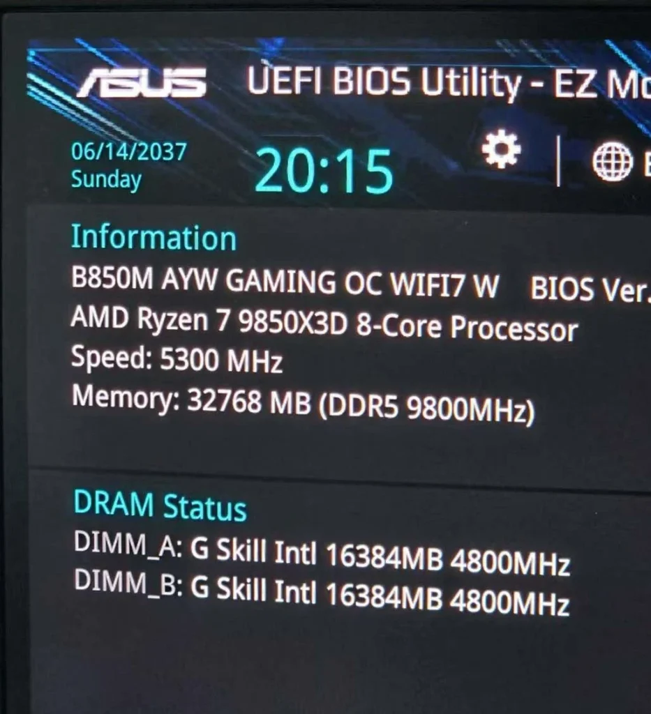 AMD Ryzen 7 9850X3D только что появился на скриншоте BIOS, на котором, судя по всему, отображается тактовая частота процессора