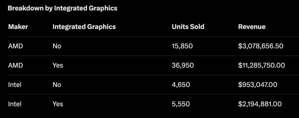 Согласно этим данным, AMD продала 36 950 чипов Ryzen с интегрированной графикой, таких как Ryzen 9 9950X и 9900X, что принесло доход в размере около 11,2 миллиона долларов. Кроме того, было продано 15 850 чипов без графических процессоров на сумму около 3 миллионов долларов. Intel, с другой стороны, продала 5550 процессоров с iGPU на сумму около 2,1 миллиона долларов, плюс 4650 вариантов под брендом F без графических процессоров на сумму 0,9 миллиона долларов. Другими словами, доля AMD составляет более 80%, независимо от того, смотрите ли вы на продажи единиц продукции или выручку.