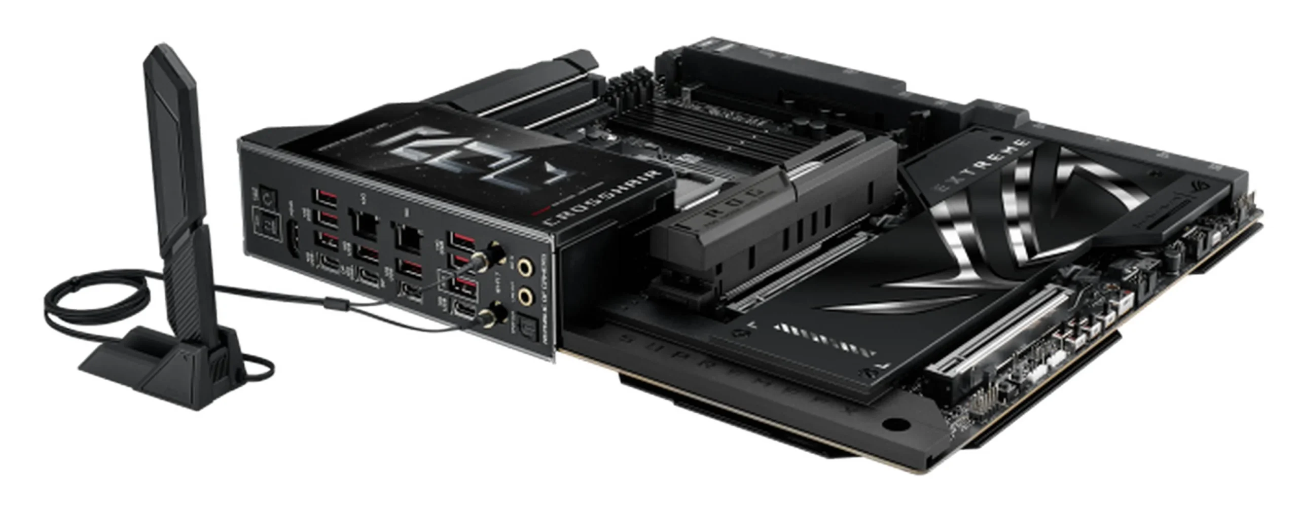 Asus ROG Crosshair X870E Extreme — это материнская плата E-ATX размером 30,5 см x 27,7 см, работающая на базе высокопроизводительного чипсета AMD X870E. Она оснащена 20 (110 А) + 2 (110 А) + 2 (80 А) фазами питания, которые подаются через два 8-контактных разъема. Вы также найдете два слота PCIe 5.0 x16 с достаточным пространством между ними для установки двух видеокарт. Просто имейте в виду, что скорость будет ограничена x8, когда оба слота заняты. Впрочем, это не так уж и важно даже для GeForce RTX 5090.
