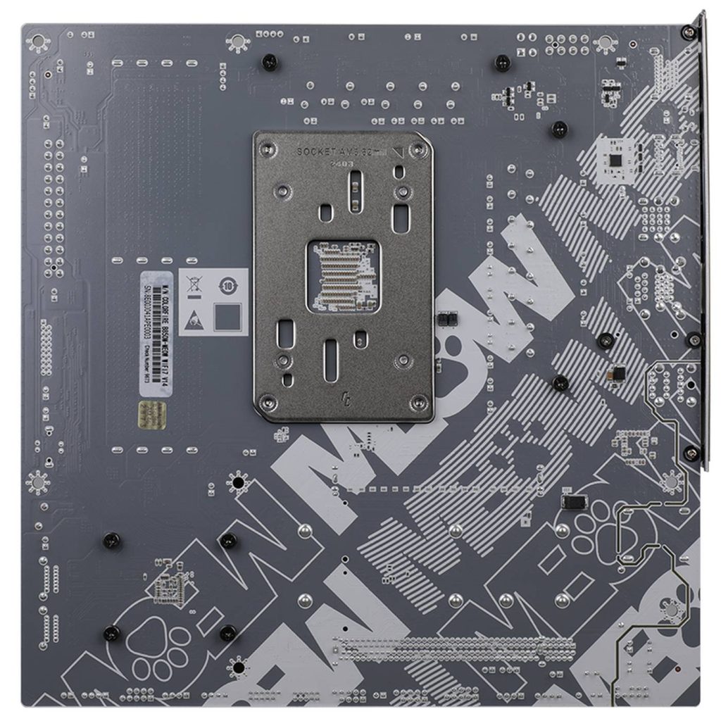 Новая материнская плата B850M-MEOW WIFI7 V14 превосходит свою предшественницу B850M-A MEOW WIFI Orange как по стилю, так и по техническим характеристикам. Помимо белой темы с изображением кота, которое распространяется и на заднюю часть платы, эта модель поставляется с пользовательским BIOS, который выглядит уникально и в то же время функционально. Больше всего мне нравится задняя часть материнской платы, но, к сожалению, вы видите её только один раз — во время распаковки и установки.
