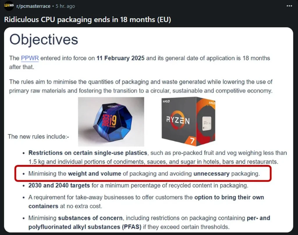 По сути, этот регламент требует отказаться от ненужной упаковки, которая занимает больше веса и объема, чем необходимо для безопасной доставки продукта. Хотя это не единственная упаковка в этом положении, на ум приходят коробки Intel Core i9-9900K и AMD Threadripper 2950X. Кроме того, к 2040 году в упаковке должен использоваться минимальный процент переработанного содержимого. Nvidia, похоже, уже начала готовиться к выпуску картонных коробок Founders Edition RTX 50 Series, которые соответствуют тонкой грани стиля и экологичности.