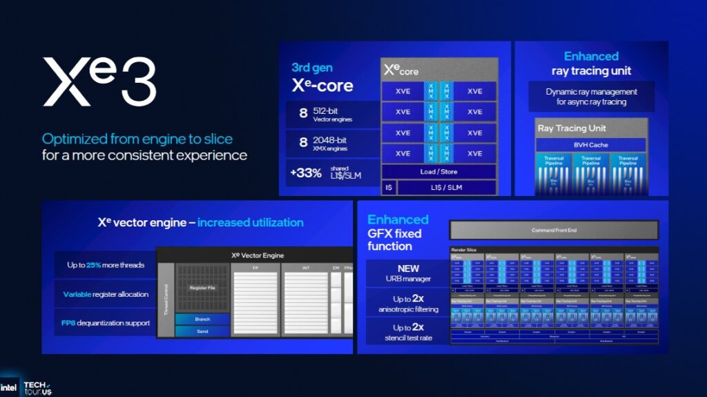 - Блок графического процессора: в нем будет встроенное графическое ядро, которое должно быть основано на архитектуре Xe3 и должно содержать специализированные ядра с ускорением трассировки лучей и массивы для искусственного интеллекта.