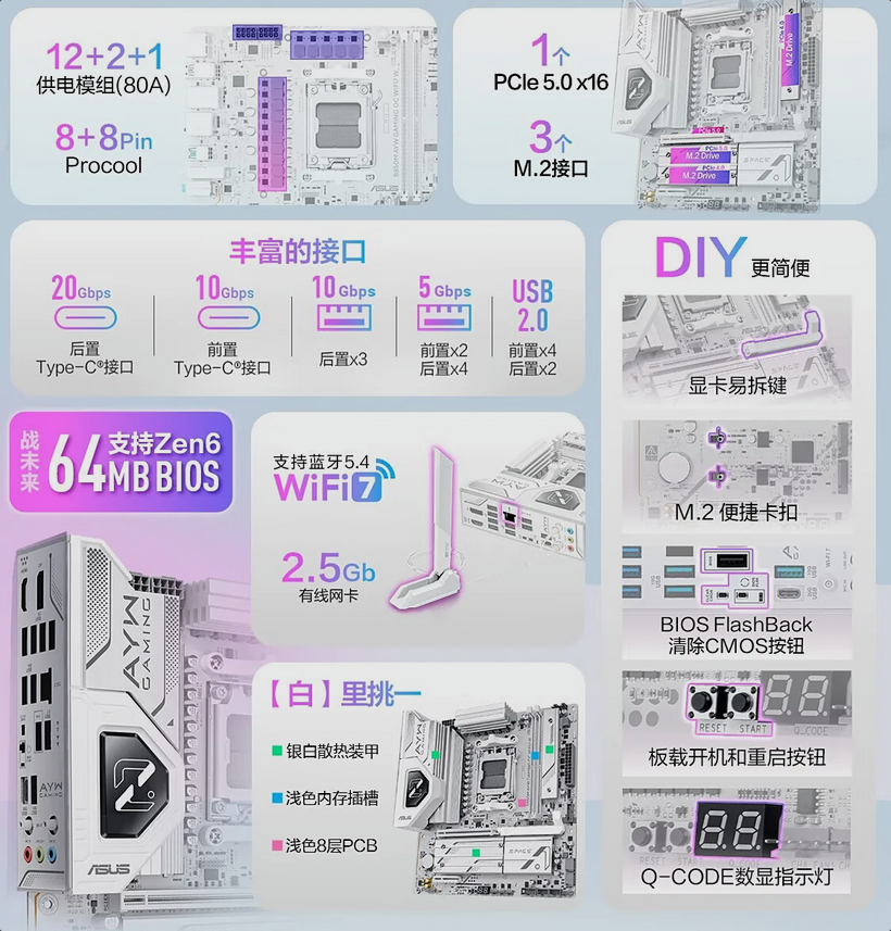 Официальные маркетинговые материалы для новой игровой материнской платы B850M AYW Gaming OC от Asus подтверждают, что плата рассчитана на будущее и поддерживает чипы Zen 6. В описании продукта указаны ожидаемые характеристики, такие как совместимость с Ryzen 9000 и поддержка памяти DDR5-9600 MT/s. Среди прочих деталей была информация о том, что плата имеет 64 МБ памяти BIOS, которая помечена как готовая для Zen 6. Поскольку эта материнская плата использует процессорный разъём AM5, это означает, что чипы Zen 6 будут совместимы с этим разъёмом.