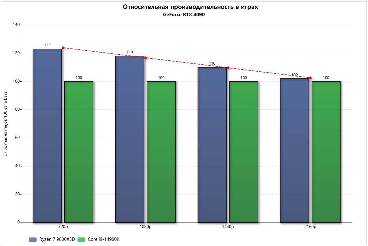 По этой причине, когда мы играем в 1080p на GeForce RTX 5090, мы видим, что разница между использованием Ryzen 7 9800X3D и Intel Core i9-14900K может составлять в среднем более 20% в зависимости от каждой игры. Однако, когда мы увеличиваем разрешение до 4K, разница в пользу первого обычно снижается до 2-4%, также в зависимости от каждой игры.