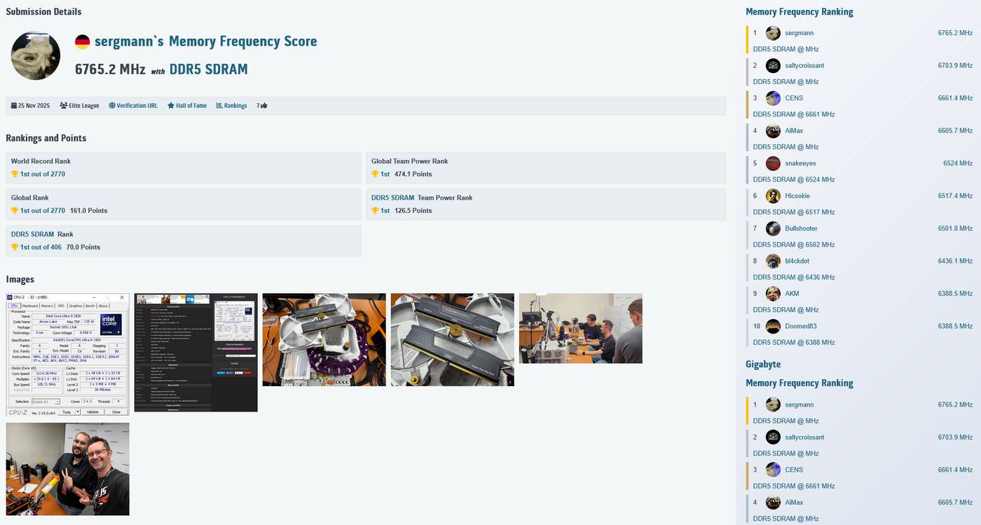 Установлен новый мировой рекорд частоты DDR5, поднявший планку до ошеломляющих 6765,2 МГц, или, говоря более простым языком, 13 530 МТ/с. Этот прорыв был осуществлён оверклокером Сергманном при поддержке HiCookie и Gigabyte, что на 122,6 МТ/с больше, чем у предыдущего рекордсмена saltycroissant. Хотя эта разница может показаться незначительной, для её достижения требуется много усилий и знаний, не говоря уже о большом количестве жидкого азота.
