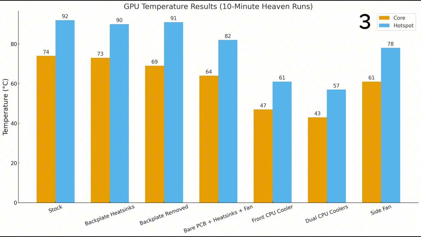 Первым шагом в улучшении охлаждения видеокарты стало простое наклеивание двух базовых алюминиевых блоков поверх задней панели, что позволило снизить температуру всего на 1 °C. Полное снятие задней панели снизило температуру ядра ещё на 4 °C, но температура в самой горячей точке изменилась незначительно. Подключение вышеупомянутых алюминиевых блоков непосредственно к обратной стороне печатной платы с использованием большого количества термопасты дало наилучшие результаты. При такой настройке температура графического процессора достигала 64 °C в ядре и 82 °C в горячей точке, что на 10 °C ниже, чем в стандартных условиях.