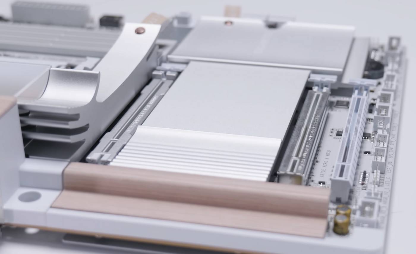 Если вы планируете собрать полностью белую систему, особенно в корпусе с деревянной передней панелью, то X870E Aero X3D Wood должен быть в вашем списке. От печатной платы до разъёма — всё либо белое, либо светло-серое. Даже оттенок светлого дерева едва заметен: деревянные акценты расположены поверх радиатора VRM и по краям съёмного радиатора SSD.