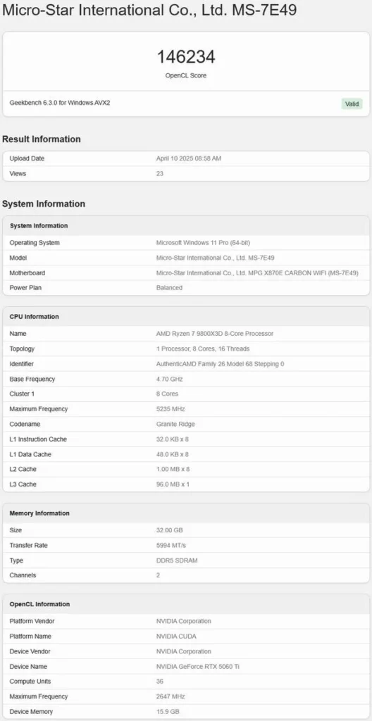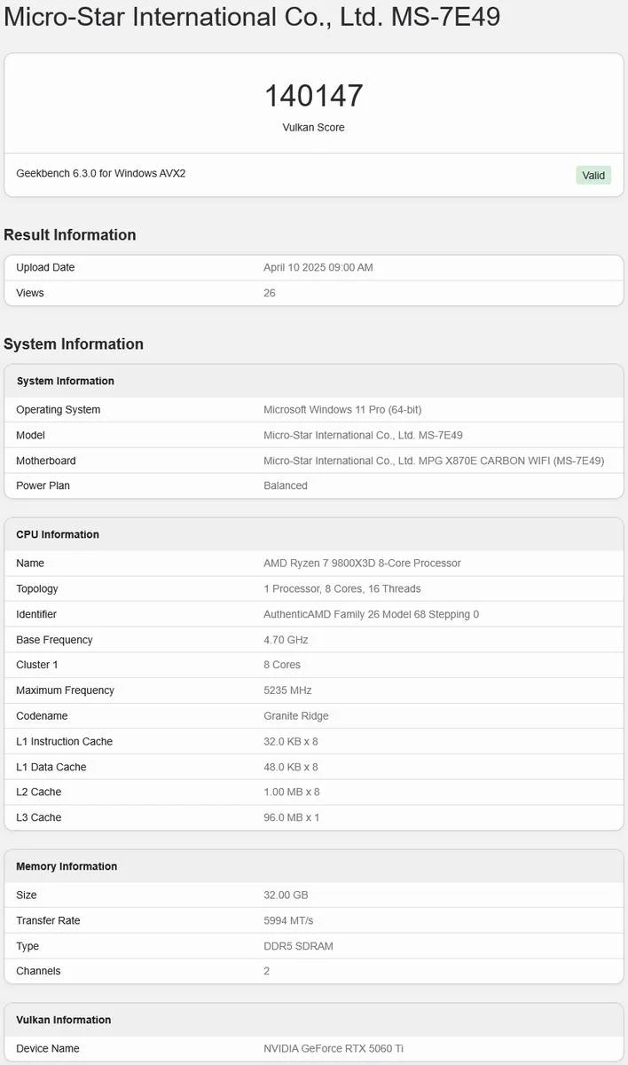 Согласно новым результатам Geekbench, GeForce RTX 5060 Ti набрала 146 234 балла в тестах OpenCL и 140 147 баллов в тестах Vulkan. Это на 12% и 14% опережает RTX 4060 Ti в каждом тесте соответственно. Хорошее улучшение, учитывая жалкое увеличение числа ядер CUDA на 5,8%. Похоже, Geekbench нравится на 55% более высокая пропускная способность памяти, предлагаемая памятью GDDR7 карты, а также более широкие архитектурные улучшения Blackwell.