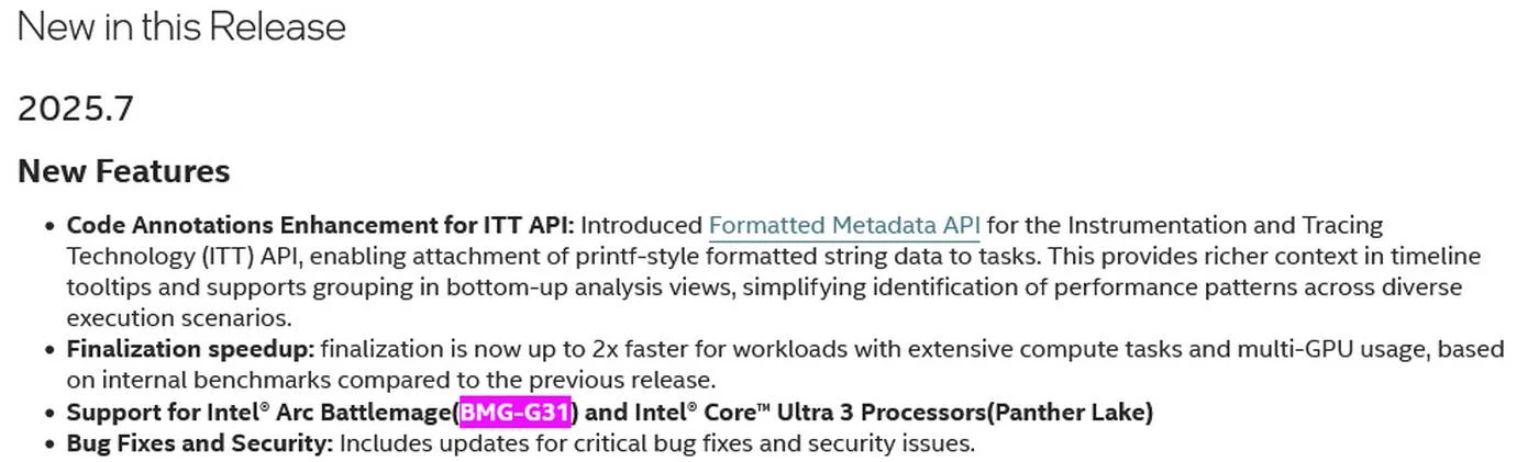 В последнем журнале изменений VTune, опубликованном 4 декабря 2025 года, компания Intel упомянула поддержку как графического процессора BMG-G31, так и процессоров Core Ultra 3 Panther Lake. Это первый случай, когда этот графический процессор упоминается в официальной документации, поскольку предыдущие сообщения были основаны на стороннем программном обеспечении или транспортных накладных. Другими словами, после нескольких месяцев ожидания Intel, похоже, наконец готова рассказать о большом Battlemage. Кроме того, упоминание BMG-G31 и Panther Lake в одном предложении может намекать на то, что первый из них также будет представлен на выставке CES 2026.