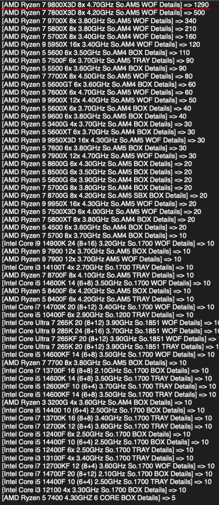Чтобы поместить эти данные в контекст, вторым самым продаваемым процессором за этот период был Ryzen 7 7800X3D, и было продано 500 единиц этого процессора. На третьем месте находится Ryzen 7 9700X с 340 проданными устройствами, а на четвертом и пятом местах — Ryzen 7 5800X и Ryzen 7 5700X с 210 и 160 проданными устройствами.