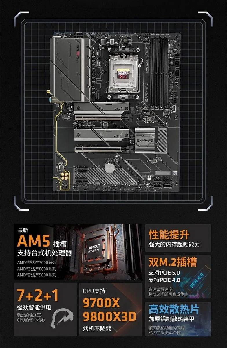 Sapphire явно заявляет о поддержке Ryzen 7 9800X3D и 9700X. Ничто не мешает вам установить более или менее мощный процессор, но последний вариант — более разумный ход, учитывая, что материнская плата имеет только 7+2+1 фазную конструкцию.
