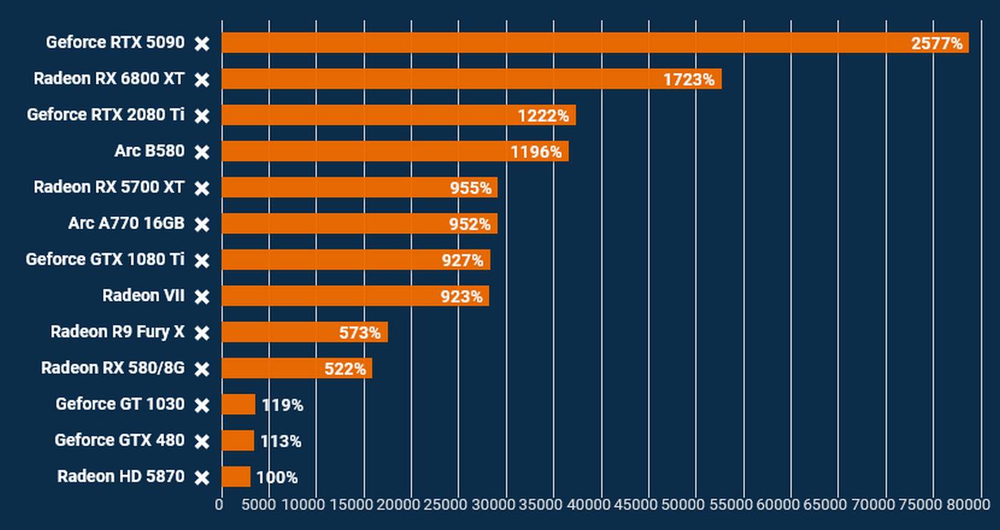 Ещё одно интересное сравнение — с видеокартой AMD HD 5870, которая в своё время была настоящим монстром. Здесь RTX 5090 опережает её на 2477 % в 3DMark, на 920 % в Bioshock и на целых 2790 % в Tomb Raider.