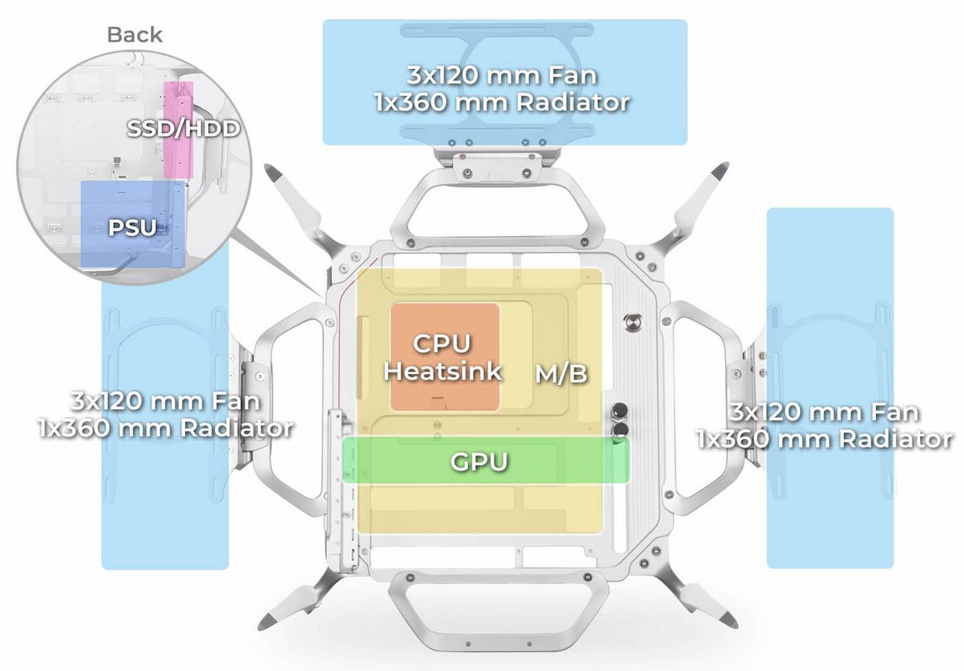 Чтобы упростить процесс сборки и модификации, компания InWin создала специальное мобильное приложение для Android и iOS с интерактивным 3D-руководством пользователя. В компактном виде корпус имеет размеры 490 мм (Д) x 490 мм (Ш) x 309 мм (В), а в увеличенном — 773 мм (Д) x 773 мм (Ш) x 309 мм (В), а его вес составляет 4,25 кг.