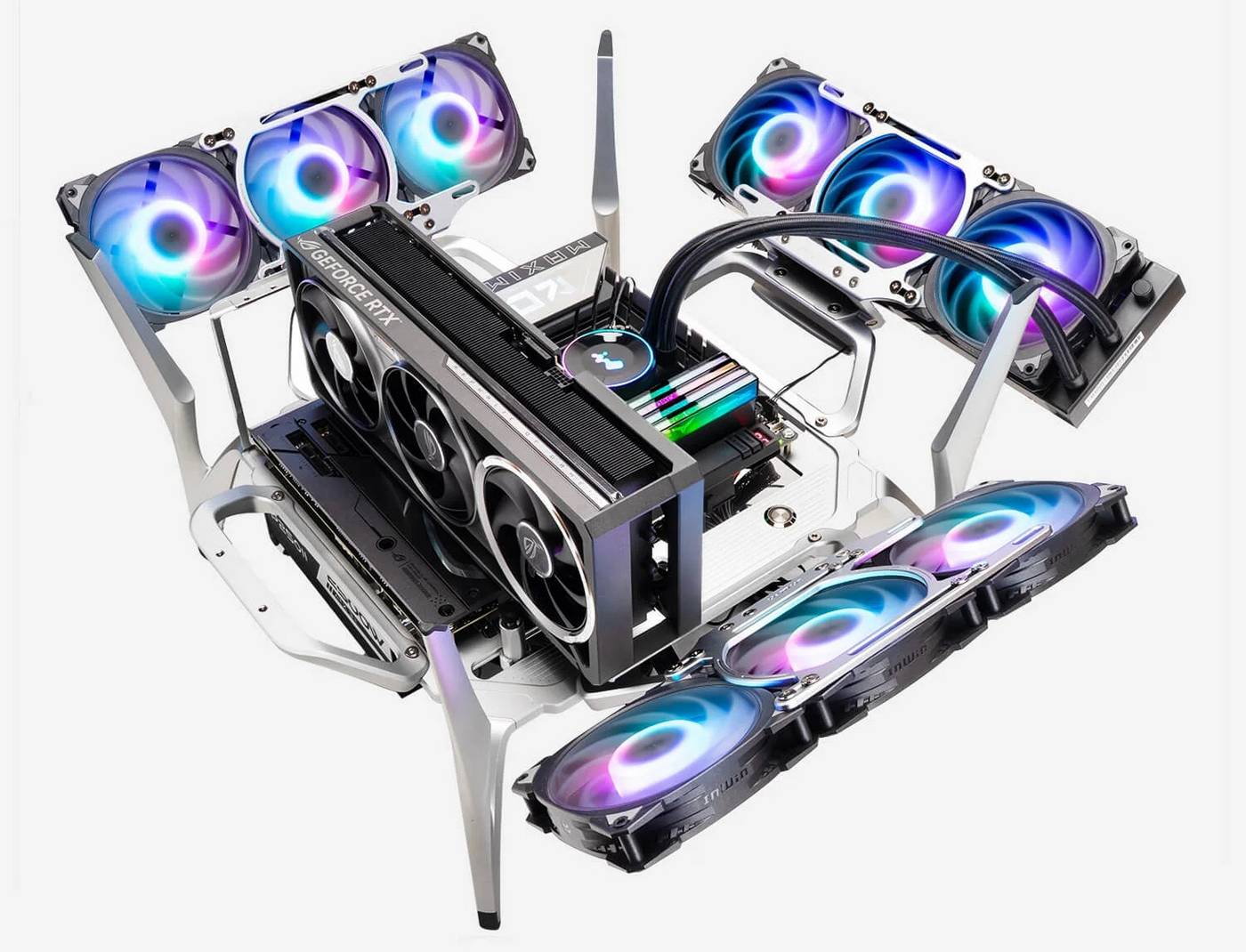 Каждая деталь корпуса Shift продумана с учётом предпочтений пользователя. Вы можете повернуть каждый из трёх кронштейнов для вентиляторов под нужным углом, выбрать между вертикальным и горизонтальным креплением графического процессора или положить корпус плашмя на стол, чтобы создать подобие испытательного стенда. Он даже поддерживает два блока питания, а также материнские платы Asus BTF и MSI Project Zero с разъёмом на задней панели. Помимо возможности поворота на любой угол от 0° до 90°, дополнительные кронштейны также поддерживают блоки питания и накопители. Отличный вариант, если у вас есть одна из этих модных видеокарт с ЖК-дисплеем.