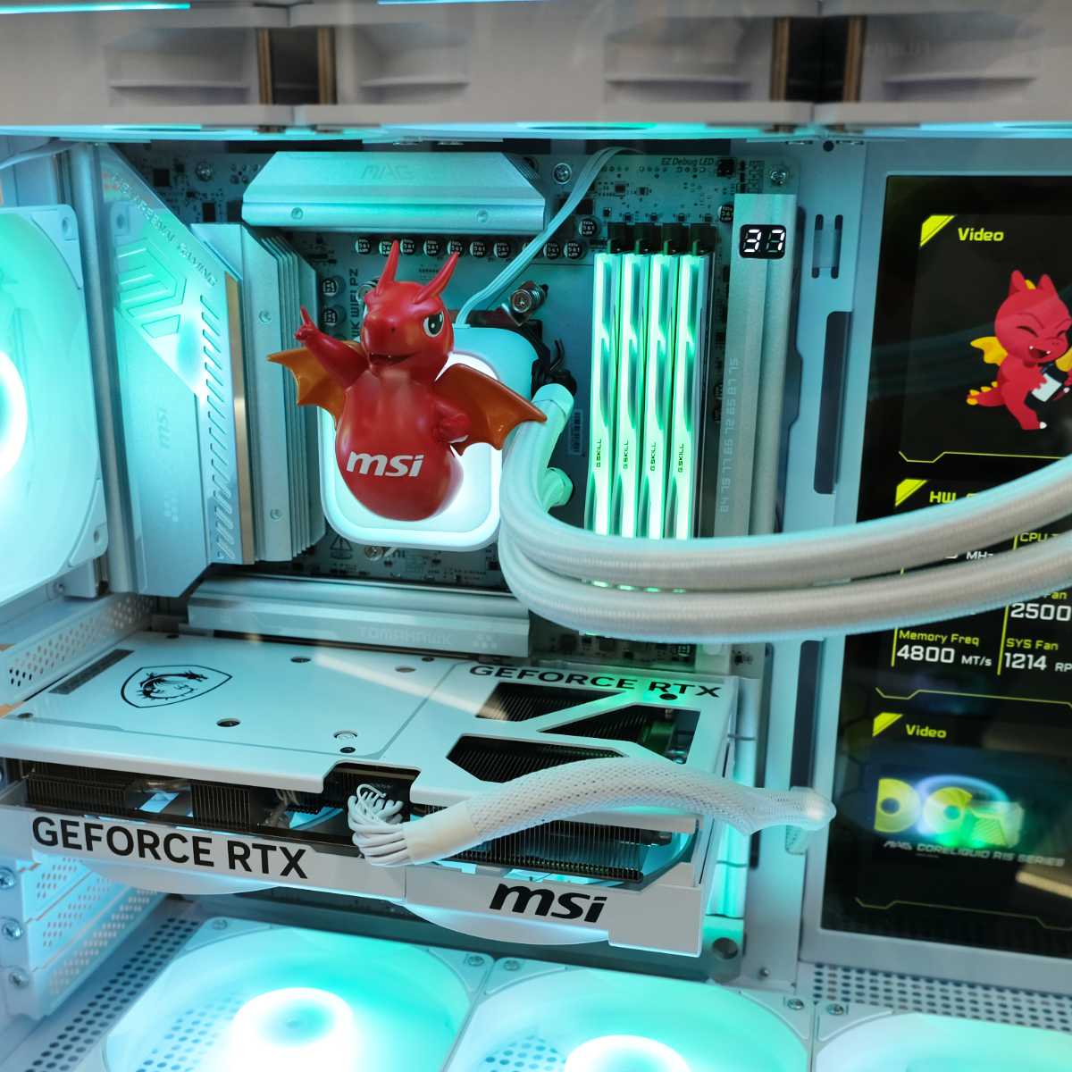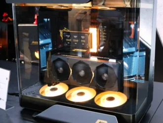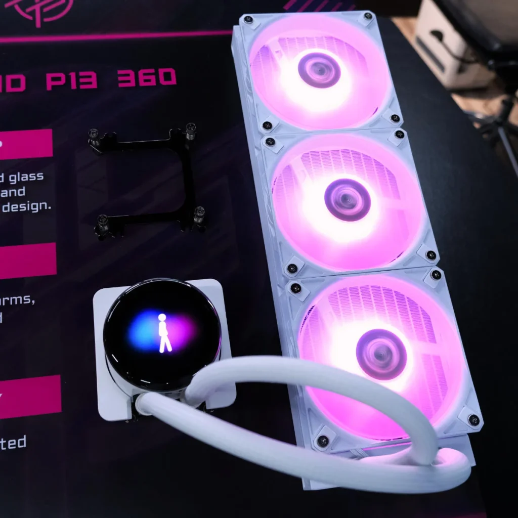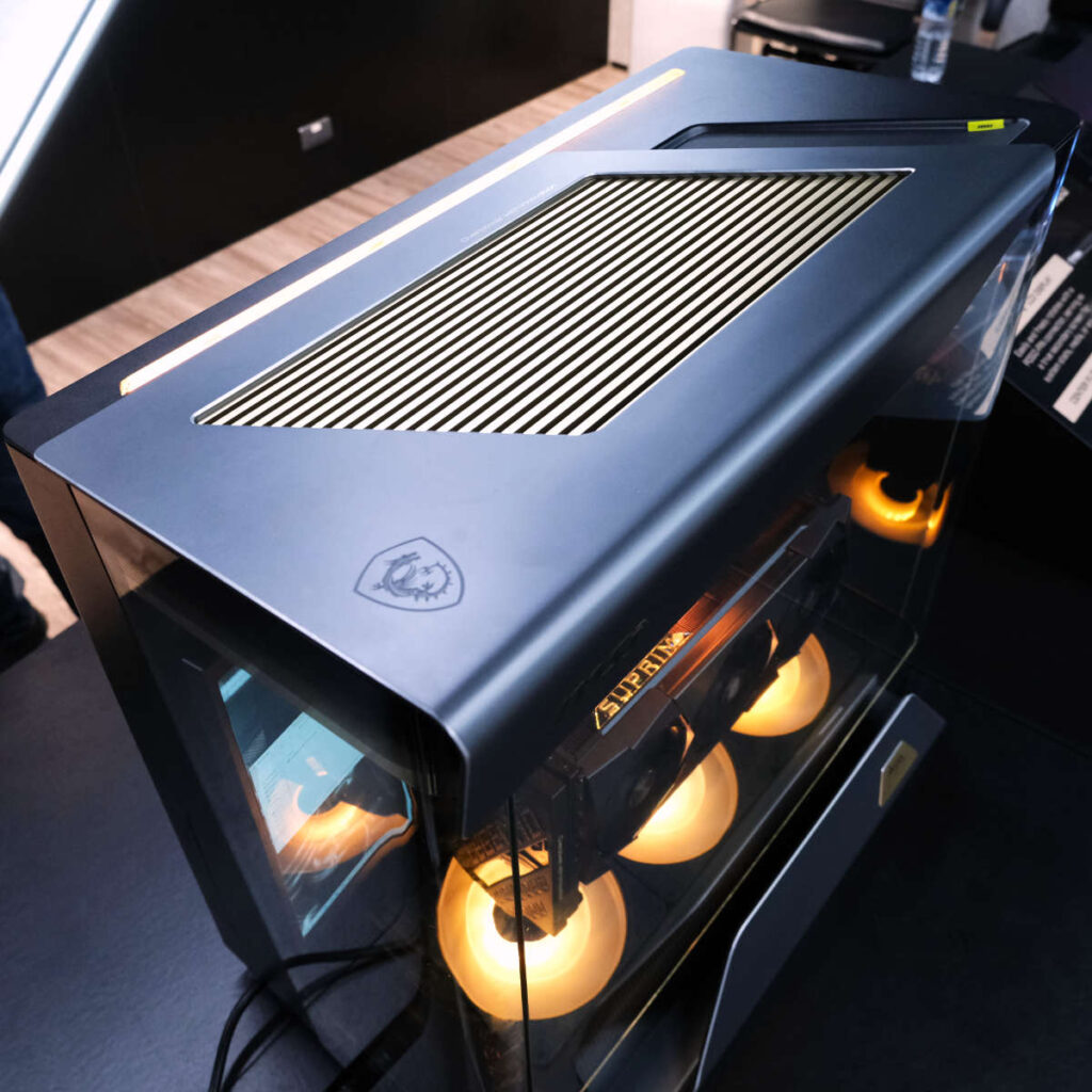 Представленный на выставке Maestro 900L был не просто пустой оболочкой. MSI оснастила довольно просторную систему вертикальным графическим процессором GeForce RTX 5080 Suprim, водяным охлаждением MEG CoreLiquid E13 360, двумя боковыми экранами и стильными RGB-акцентами, подсвечивающими корпус сверху донизу. Это тоже не прототип, а скорее безошибочное заявление: именно так, по мнению MSI, должны выглядеть бутик-ПК.