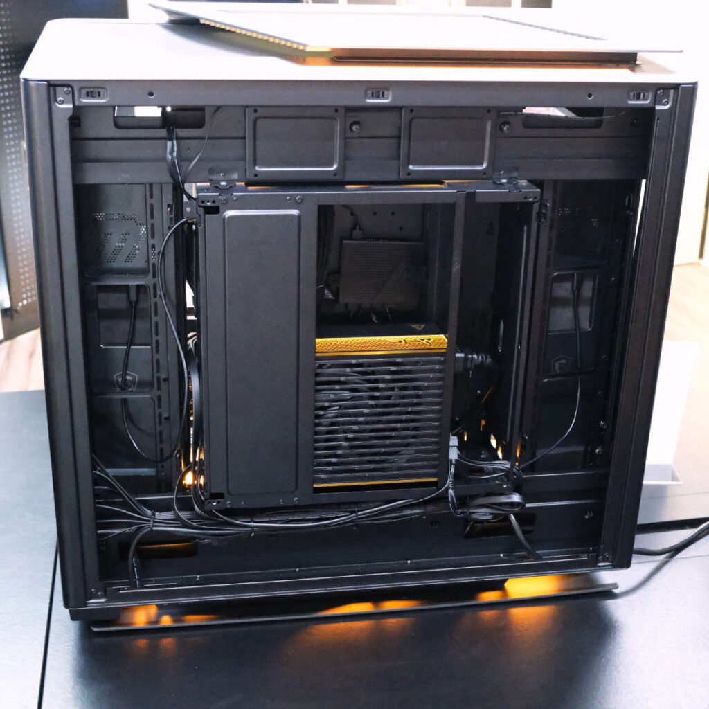 Снаружи это настоящее удовольствие для глаз. Панорамные стеклянные боковые панели позволяют беспрепятственно рассмотреть каждый компонент. Выпуклое основание, направленное вперед, придает компьютеру плавный вид, а линия крыши из матового металла, увенчанная золотой вентиляционной решеткой, подчеркивает его роскошь. Сзади блок питания и кабели полностью скрыты и проходят через незаметную вторую камеру, которая позволяет сосредоточиться на внутренних компонентах.