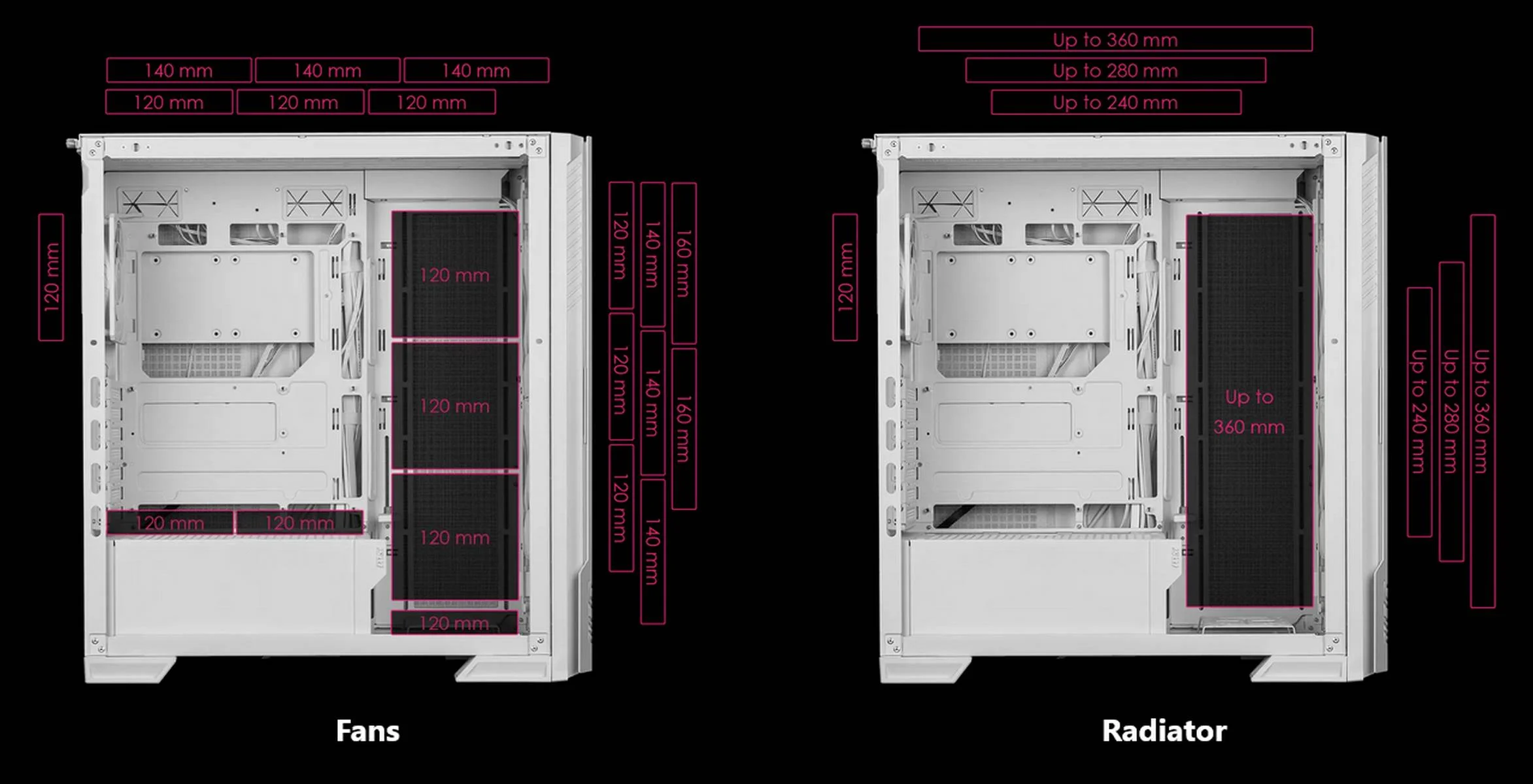 Пока мы этим занимаемся, вы можете установить до трех 360-мм радиаторов спереди, сбоку и сверху, а также 120-мм сзади, чего достаточно для охлаждения любой игровой конфигурации. Хотя это и неплохо, многие пользователи также выберут воздушное охлаждение, чтобы воспользоваться его абсурдной поддержкой вентиляторов, которая вмещает до шести 140-мм плюс семь 120-мм вентиляторов, или 13 120-мм. Три из них можно обменять на два 160-мм спереди. То же самое можно сделать с боковыми, которые можно заменить на модную пластину распределения воды.