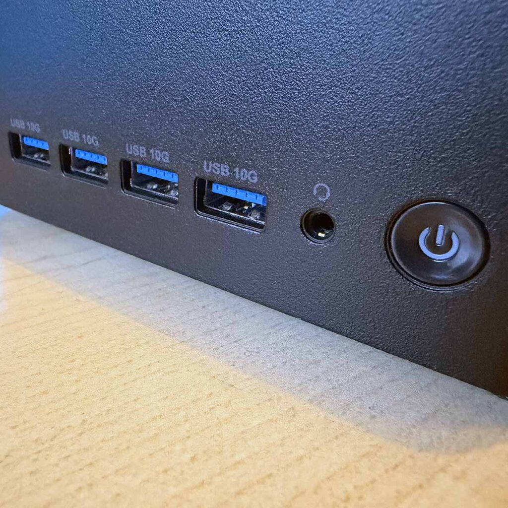 Несмотря на свои небольшие размеры, MSI оснастила этот крошечный ПК множеством портов. На передней панели расположен аккуратный ряд из четырех портов USB-A, все они поддерживают USB 3.2 Gen 2 со скоростью до 10 Гбит/с. В отличие от вышеупомянутого корпуса Sapphire, с левой стороны есть устройство для чтения SD-карт. Это часто упускаемое из виду, но действительно удобное дополнение, если вы, например, регулярно переносите файлы с цифровой зеркальной камеры.