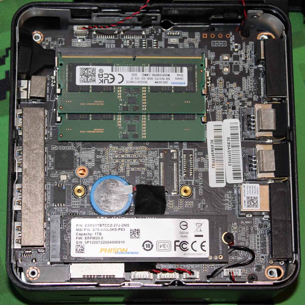Для этого можно установить два модуля памяти DDR5 SO-DIMM для двухканальной системы емкостью до 64 ГБ. К сожалению, для хранения данных предусмотрен только один слот M.2. Это немного разочаровывает, учитывая, что в некоторых новейших мини-ПК, которые мы видели, есть два или три слота для твердотельных накопителей M.2 2280. Это ограничивает ваши возможности, когда твердотельные накопители дорожают, поскольку вы можете просто захотеть добавить дополнительный накопитель небольшого размера, а не заменять весь твердотельный накопитель новой моделью.