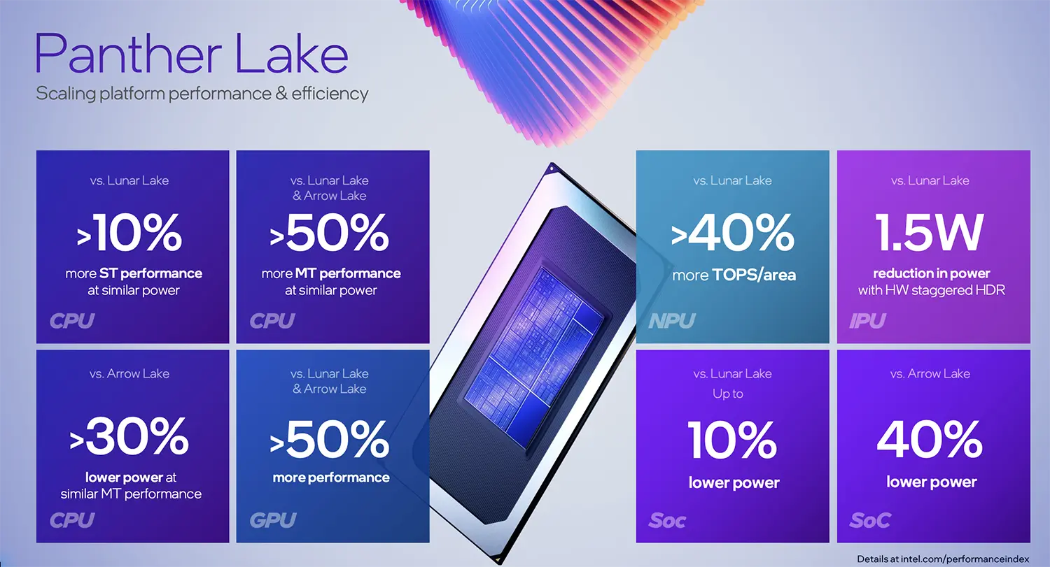 Компания GMKtec планирует установить для процессора TDP в 80 Вт, что должно обеспечить ему достаточный запас мощности. Для сравнения: такие чипы обычно работают при мощности около 45 Вт, чтобы не перегружать системы охлаждения ноутбуков. Неясно, будет ли у пользователей возможность вручную увеличить этот показатель, чтобы получить больше мощности. Что касается производительности по умолчанию, Intel утверждает, что Panther Lake обеспечивает на 50 % более высокую многопоточную производительность по сравнению с Lunar Lake и Arrow Lake при аналогичных конфигурациях питания, а производительность встроенного графического процессора также выросла на 50 %.