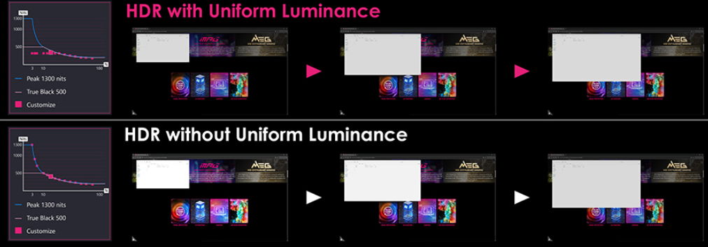 Равномерная яркость. Чтобы устранить резкие перепады яркости, которые обычно наблюдаются в стандартном HDR, эта функция позволяет создателям контента и геймерам настраивать кривую яркости HDR. Сопоставляя определенные уровни яркости с экранами разных размеров, она обеспечивает стабильную и равномерную яркость в различных ситуациях использования.
