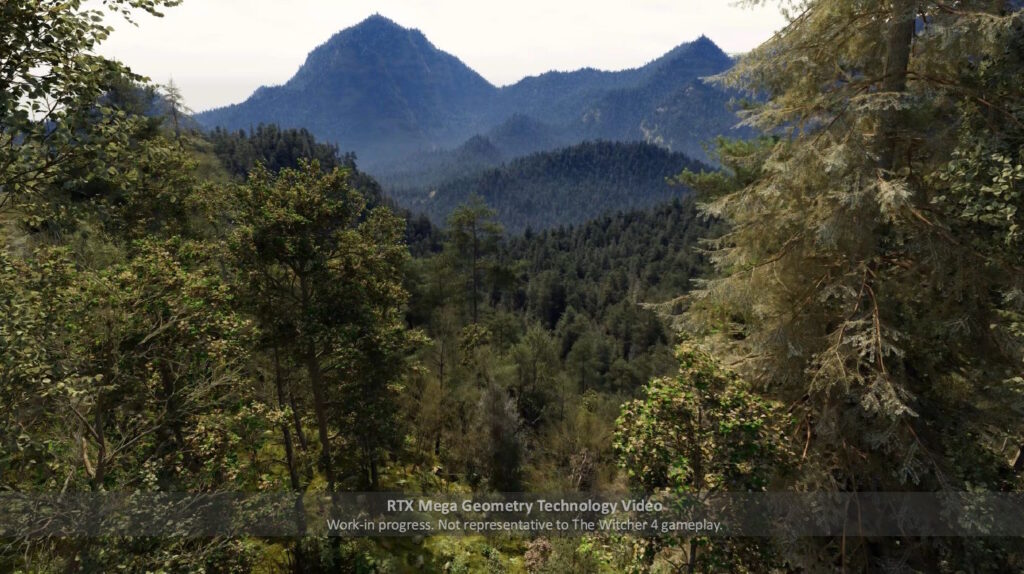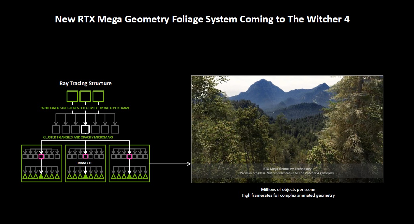 NVIDIA подтвердила, что в The Witcher IV будет использоваться новая система растительности, основанная на Mega Geometry. Он сохранит ту же основу, что означает, что на основе секционированных структур, выбранных для каждого кадра, будут создаваться блоки треугольников, и в них также будут использоваться микропленки непрозрачности, технология, которую NVIDIA представила в GeForce RTX 30 и которая также доказала, что может помочь заметно повысить производительность.