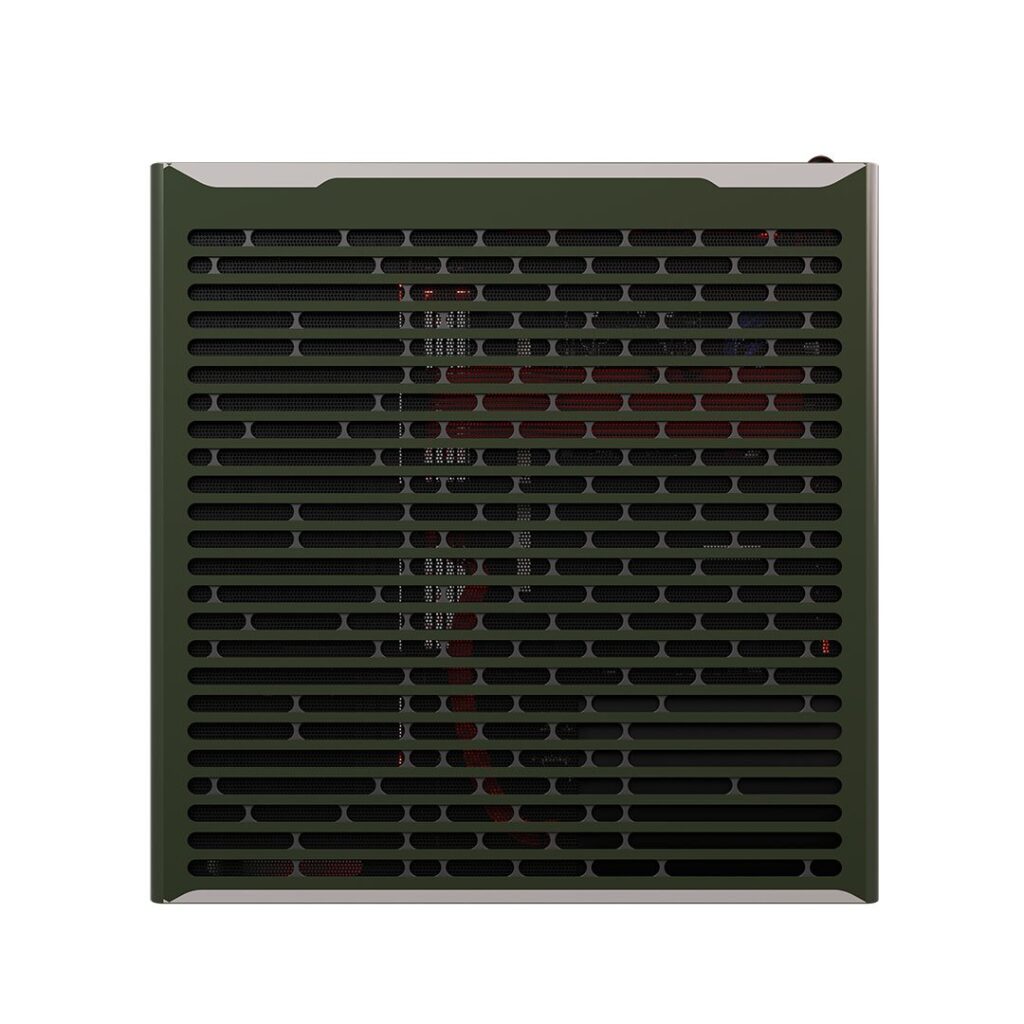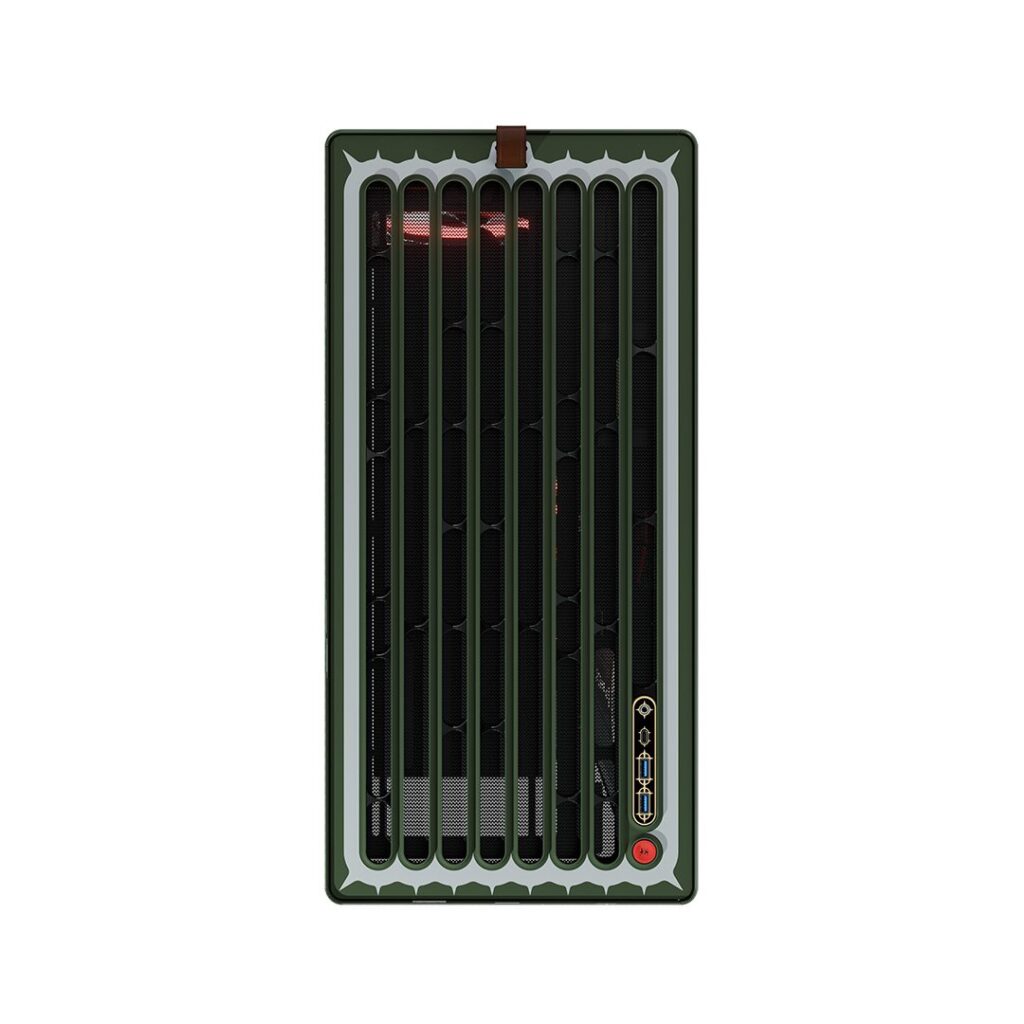Корпус, окрашенный в зелёный цвет с белыми металлическими вставками, напоминает костюм Претора с кроваво-красными брызгами Doom Slayer. Нам особенно нравится символ кнопки питания на верхней панели.