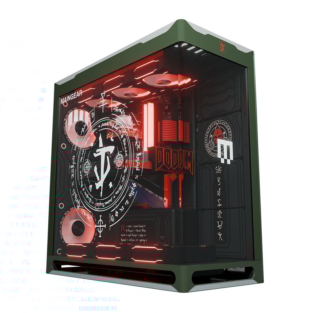 Эту систему невозможно спутать ни с чем, кроме как с данью уважения Doom: The Dark Ages. Выбранное компанией Maingear шасси HAVN HS 420, изготовленное по индивидуальному заказу, от и до пропитано духом шутера от первого лица от id Software.
