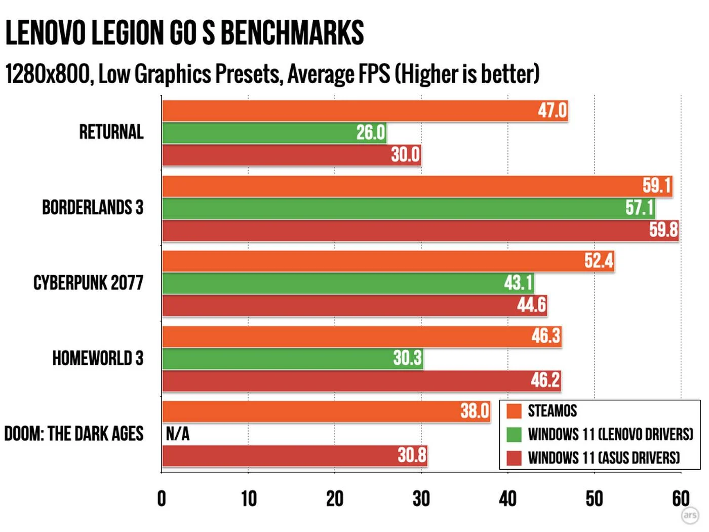 Чтобы дать обеим операционным системам наилучшие шансы на успех, Ars Technica выбрала портативную консоль Lenovo Legion Go S, поскольку она официально поддерживает как SteamOS, так и Windows 11. Из коробки устройство поставлялось с SteamOS, которая была тщательно протестирована перед установкой Windows 11 и совместимых драйверов. Что касается драйверов, то официальные драйверы Lenovo были довольно старыми, выпущенными в январе 2025 года, и поэтому были несовместимы с Doom: The Dark Ages. Розетке удалось установить драйверы Asus ROG Ally, которые, как ни странно, обеспечивали более высокую производительность, чем драйверы Lenovo.