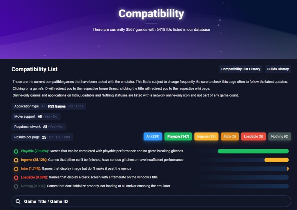 Если мы будем переключаться между разделами, мы также сможем найти списки игр, которые работают без сбоев, и игр, в которые можно играть, но с некоторыми сбоями. Они расположены в алфавитном порядке, поэтому легко найти, работают ли наши любимые игры или нет.