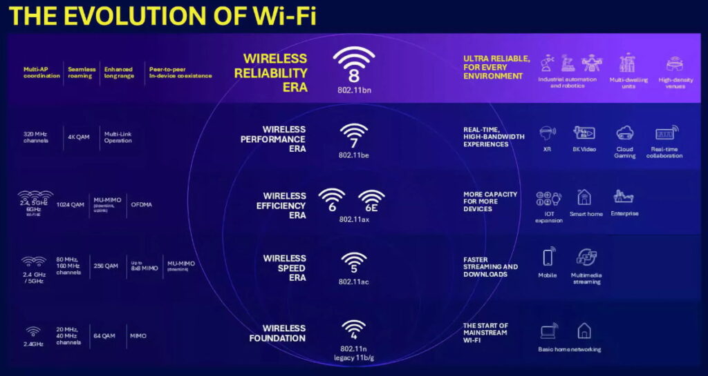В отличие от предыдущих версий, ориентированных на впечатляющее увеличение скорости, Wi-Fi 8 смещает акцент на повышение стабильности соединения, энергоэффективности и согласованности между устройствами. Это означает, что при сохранении скорости передачи данных Wi-Fi 7 стремится улучшить связь между устройствами, поддерживать производительность на расстоянии и управлять интенсивными сеансами потоковой передачи или играми, уменьшая потери сигнала и задержки.