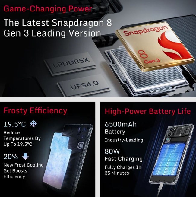 - В то время как оба смартфона оснащены чипсетом Snapdragon 8 Gen 3, RedMagic 9S Pro имеет «улучшенную версию» этого процессора с немного более высокой тактовой частотой как для центрального процессора (до 3,4 ГГц по сравнению с 3,3 ГГц), так и для графического процессора (1 ГГц).